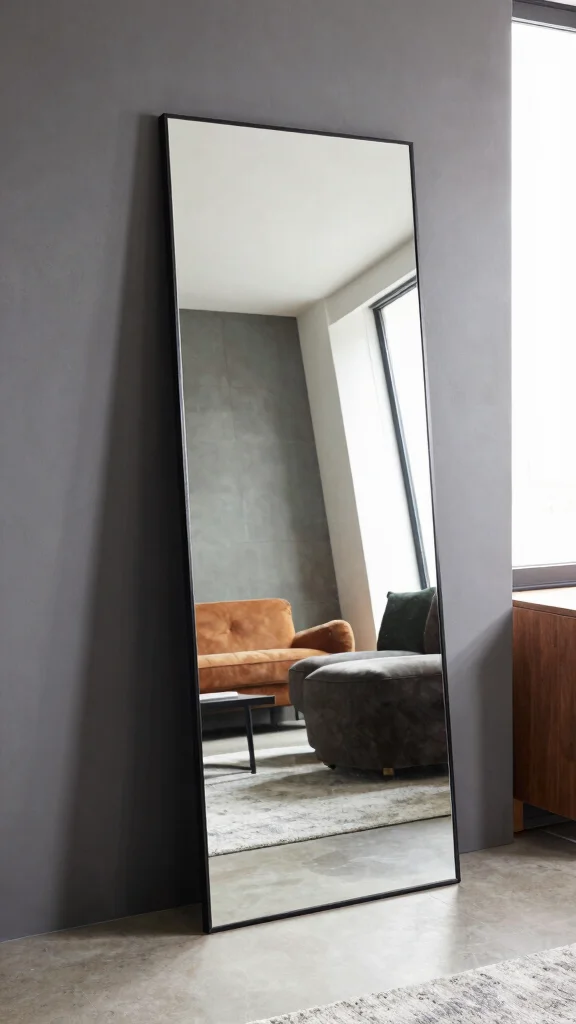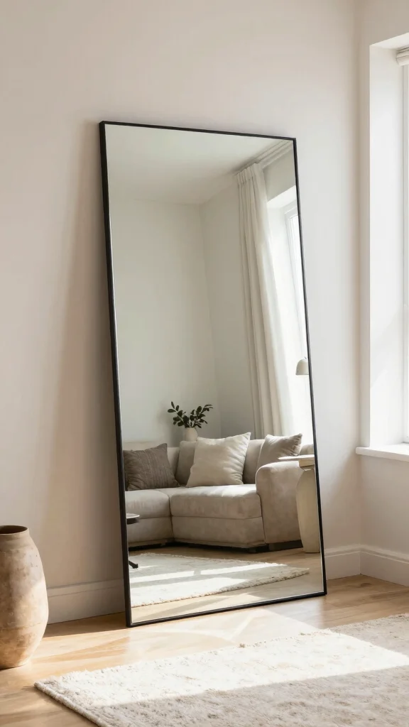 An oversized leaning mirror serves as a stunning statement piece that instantly elevates your living room’s elegance. Leaning against a wall creates a relaxed yet chic vibe while offering the illusion of more space.