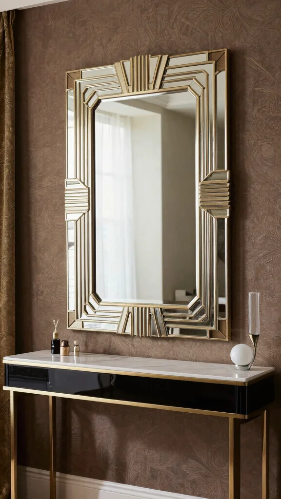 A vintage Art Deco mirror brings glamour and sophistication to your living room. With its geometric shapes and luxurious framing, it can easily become the centerpiece of your decor.