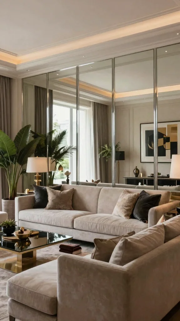 Transform your living room into a sophisticated space with mirrored wall panels. This design involves installing mirrors as panels, dramatically enhancing light and the perception of space.