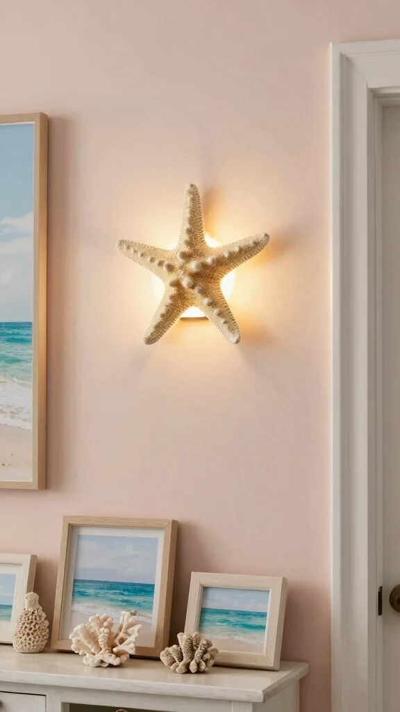 Infuse your space with a playful touch by incorporating starfish wall sconces! These whimsical fixtures mimic real starfish, offering a unique way to enhance your coastal decor. Whether placed in hallways or above side tables, they subtly emphasize the seaside theme while adding visual interest. Opt for warm finishes in whites or golds to keep the look polished and inviting.