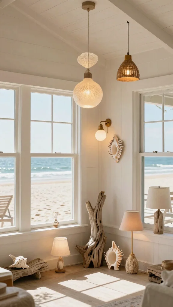 Consider nautical accents like rope-wrapped pendants, glass lanterns, and rattan shades to emphasize beach house lighting fixtures and coastal interior design. Layer lighting with warm bulbs and dimmers to create mood; position fixtures to highlight seashell décor and seaside views.