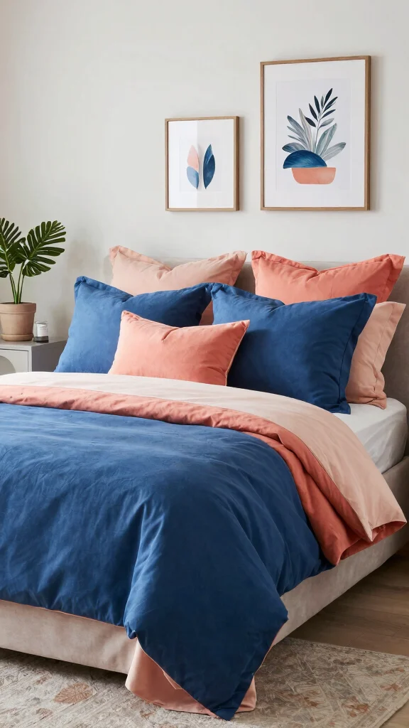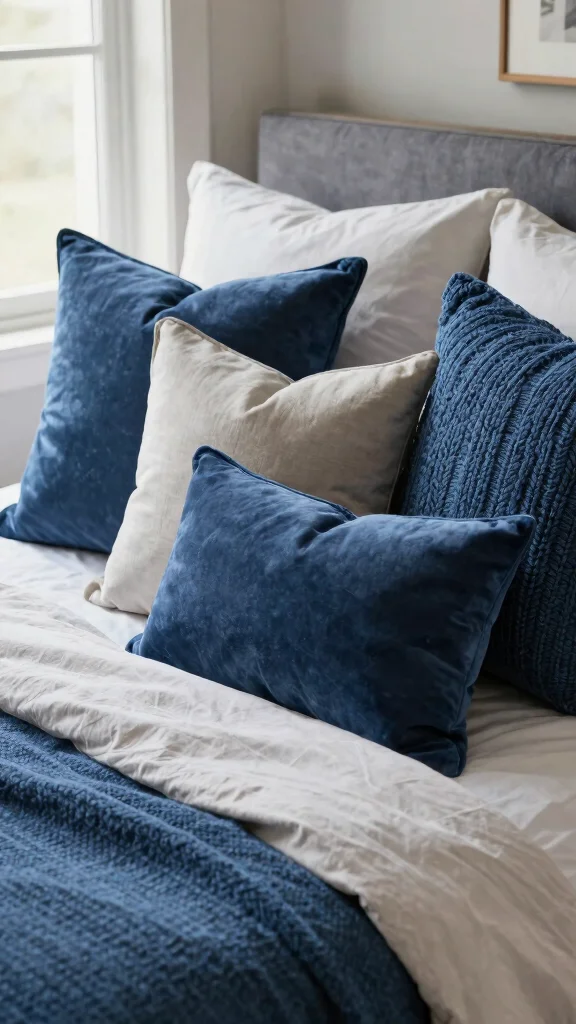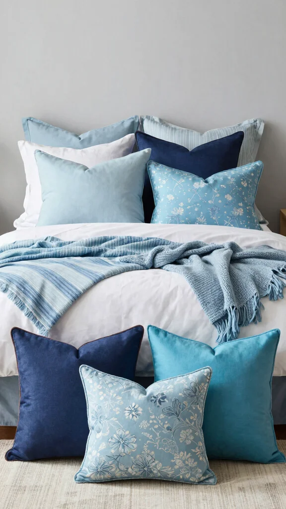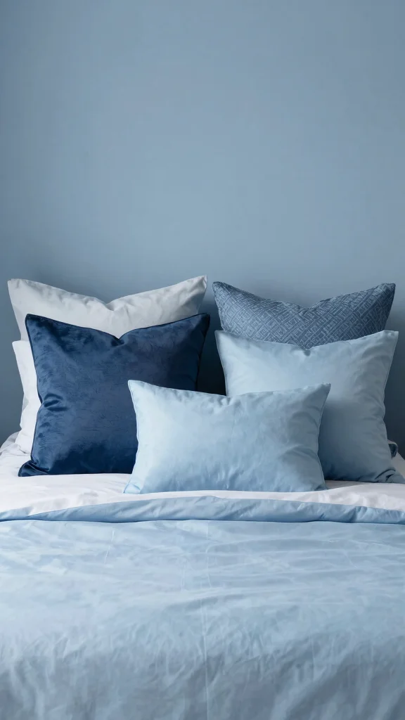 Choose covers in 2-3 shades of blue and mix textures for depth while keeping bedroom color schemes cohesive.