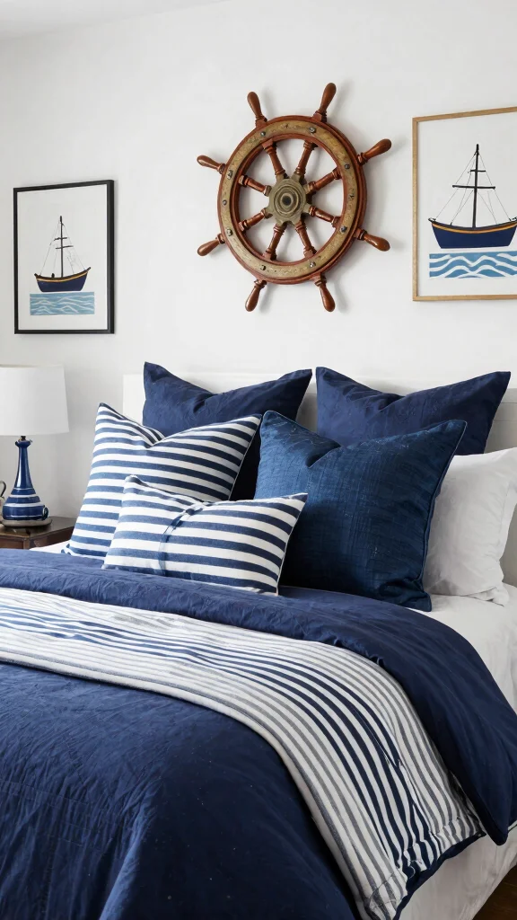 For a playful effect, mix various sizes of striped pillows. Choose rich navy stripes combined with lighter blue solids to break up patterns effectively. Adding white or cream pillows helps maintain a light and airy feel throughout the room.