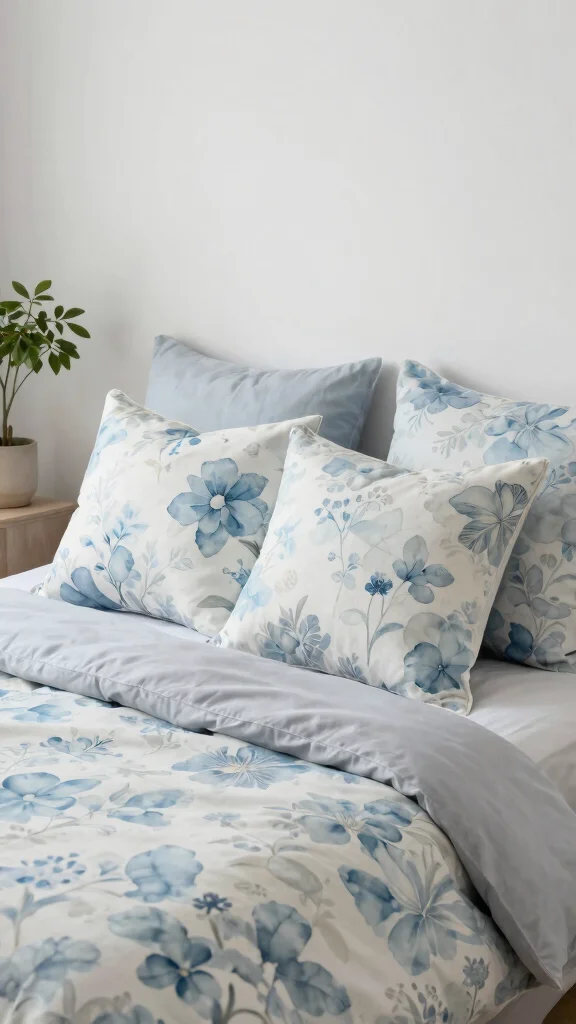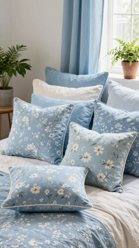 Soft patterns, like floral or watercolor designs, can create a serene atmosphere in your bedroom. Blue throw pillows adorned with gentle prints serve as beautiful accents, enhancing your overall decor while promoting relaxation. These pillows add a delicate touch, helping to cultivate a calming environment.