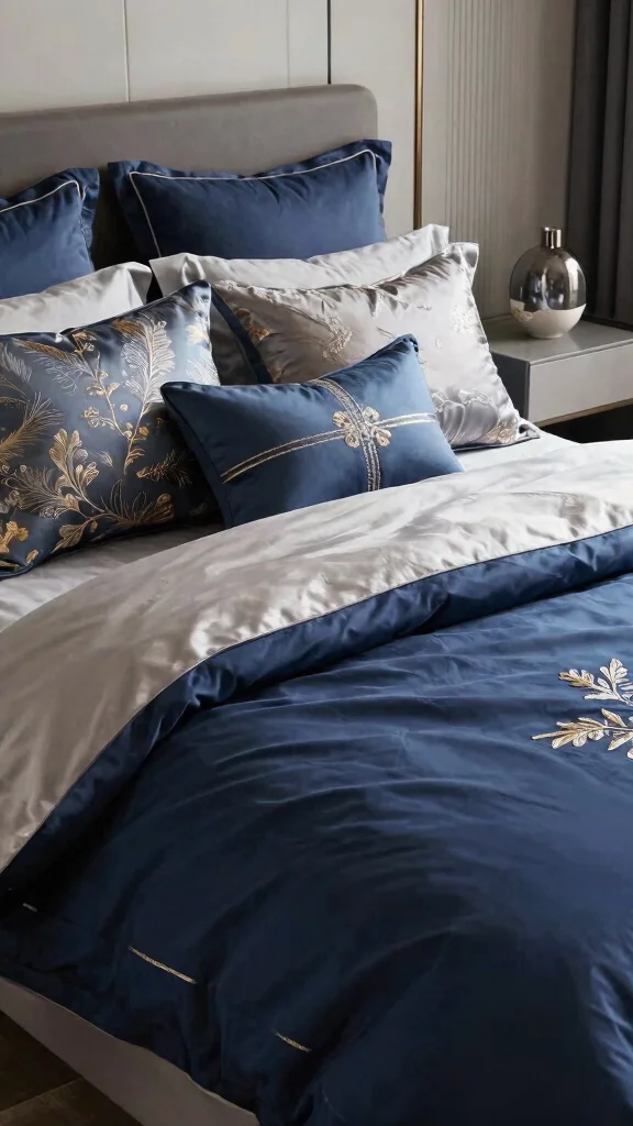 For a touch of elegance, consider blue throw pillows adorned with metallic accents, like gold or silver embroidery. These shimmering details can elevate your bedroom’s aesthetic, adding a sophisticated flair while keeping the overall vibe calm.