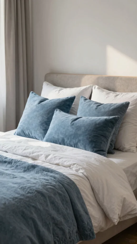 Begin with a neutral base of white, cream, or sand and introduce blue throw pillows bedroom in 2-3 hues for depth.