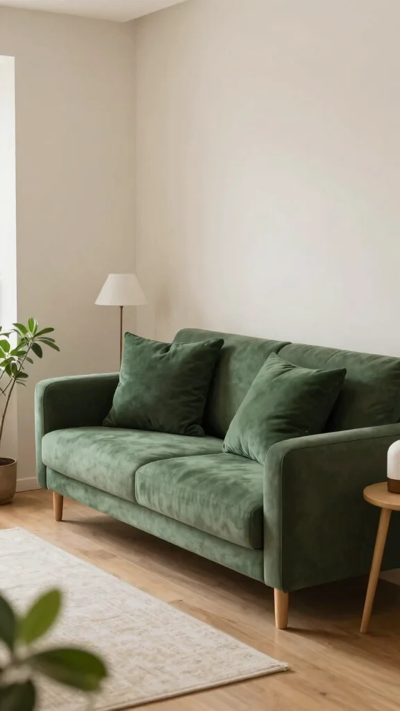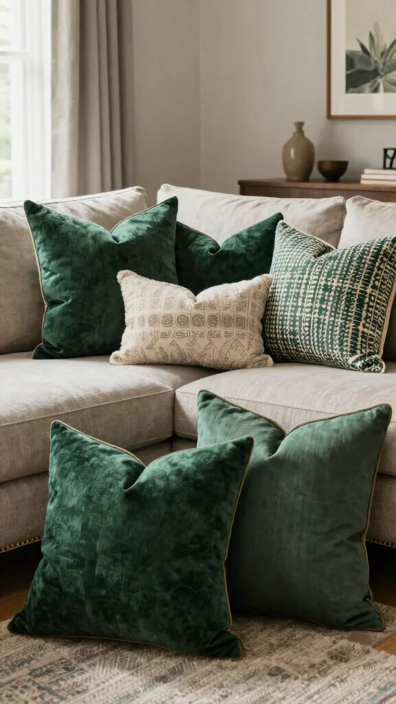 Start with a neutral base and layer with different textures to give depth without overwhelming the space. Use a couple of solid dark green throw pillows as anchors and add one or two patterned or textured throw pillows in lighter greens, cream, or warm metallic accents. This green pillow styling approach creates rich color palettes and keeps the room feeling cohesive. Mix materials like velvet, linen, and knit to add tactile interest, and keep the overall number to 4–6 pillows so the seating remains comfortable and uncluttered. Finish with a throw blanket in a complementary tone to emphasize cozy living room decor.