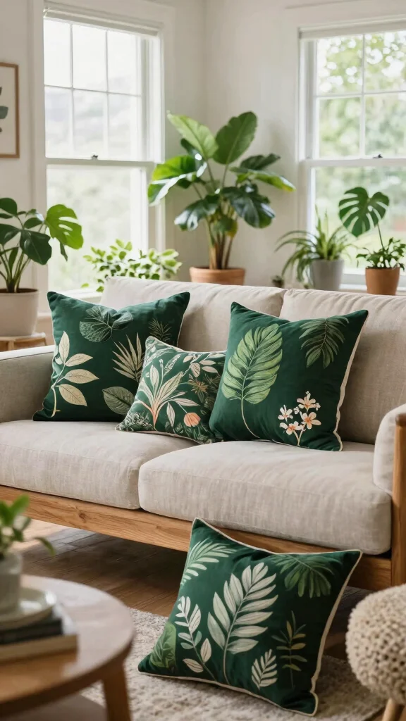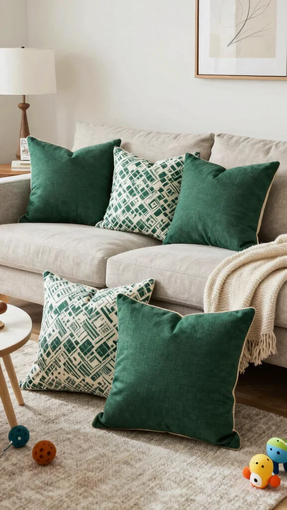 Tailor your pillow choices to each room’s theme, enhancing the overall aesthetic with dark green accents.
