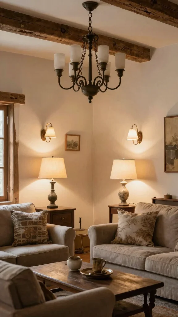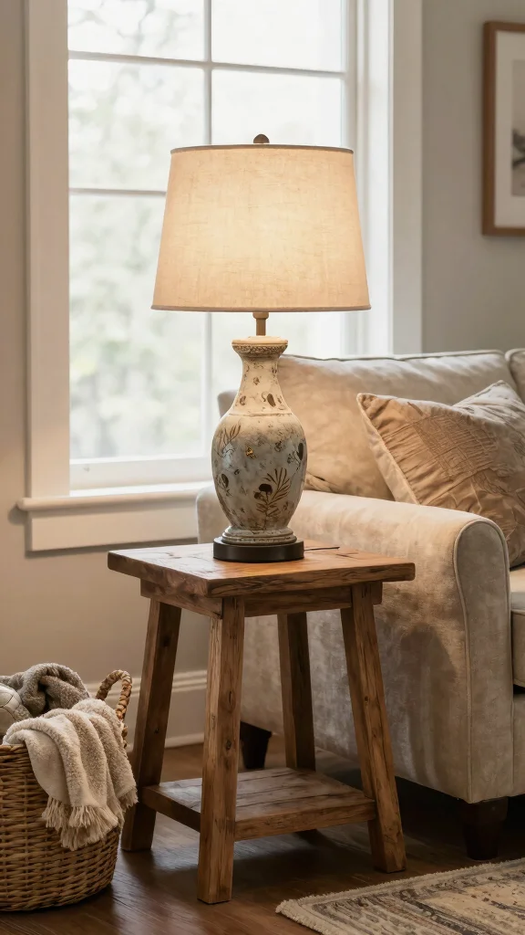 Position table lamps on side tables to illuminate spaces while adding layers to your lighting strategy. Vintage-inspired shades in linen or burlap complete the rustic look beautifully. Larger lamps work well in open areas, while smaller ones fit intimate settings perfectly.