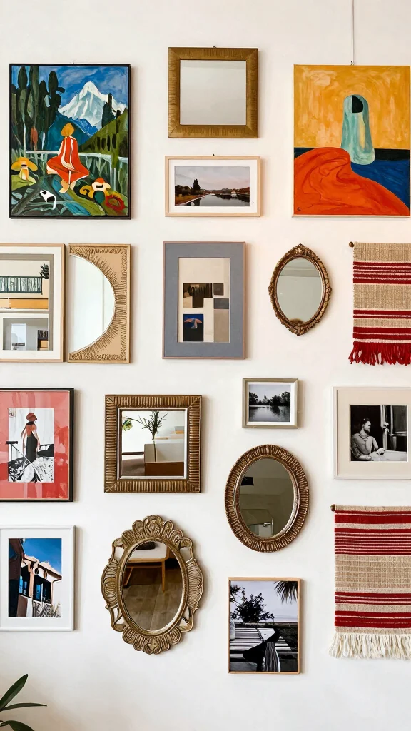 Think of using abstract designs or ethnic prints that harmonize with the colors in the mirrors. Layering these elements enhances visual contrast and elevates the overall aesthetic of your gallery wall.