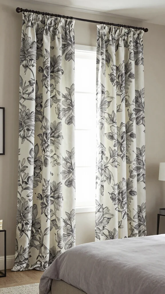 Bold patterns can feel intimidating, but they’re practical and stylish. In a grey and white curtains bedroom, geometric prints with solid bedding create energy without visual clutter, even in small bedrooms. DIY high-contrast tweaks let you own the look without breaking the budget.