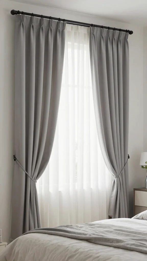 Layering is key for minimalist spaces. Start with a sheer white panel to diffuse light and keep the room bright. Add a single, solid grey curtain in a light-weight fabric for privacy without bulk, and skip heavy overlays. Use a slim curtain rod and opt for modern curtain styles with flat folds to maintain clean lines. Keep everything coordinated with a neutral color palettes and match hardware to a single metal finish so the layers disappear into the wall. If privacy is needed, choose a lightweight blackout that won’t overpower the window. Finally, let the panels skim the floor to create the illusion of height in your grey and white curtains bedroom setup.