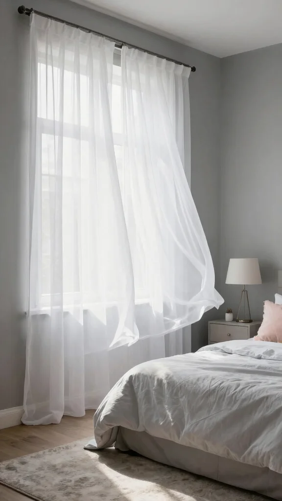 Soft white sheer curtains can beautifully transform your bedroom into a haven of light and tranquility. This delicate fabric dances with sunlight, creating a serene atmosphere that feels both airy and expansive. When paired with soft grey walls, it establishes a calming backdrop that feels effortlessly inviting. Imagine how lovely it looks with a light grey bedspread and fluffy pillows, crafting a peaceful retreat for restful nights.