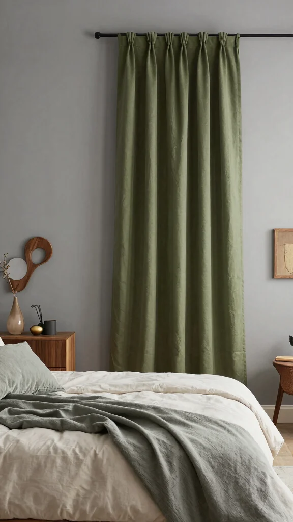 Earthy olive green curtains can provide a natural and grounding feel to your grey bedroom, enhancing the overall calming aesthetic. This muted tone beautifully complements grey, creating a harmonious environment that invites relaxation. Opting for soft fabrics can further enhance the cozy atmosphere, making the room feel nurturing and inviting.