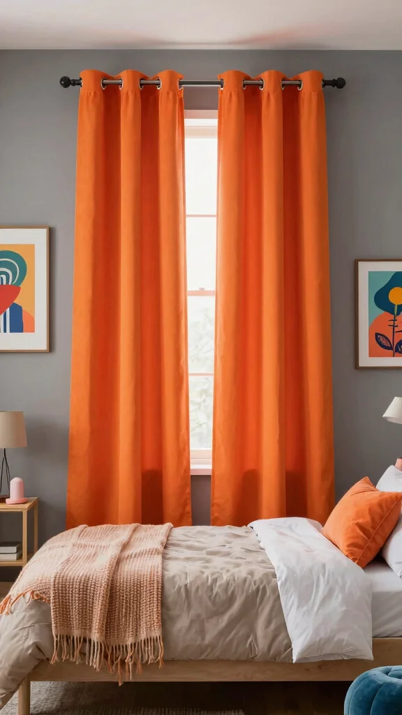 Bright tangerine curtains can inject a fun and energetic vibe into your grey bedroom, creating a lively and engaging atmosphere. This vibrant color contrasts beautifully with grey, allowing you to make a bold statement without sacrificing style. Pairing tangerine drapes with grey walls creates a focal point that captures attention and adds character to your decor.