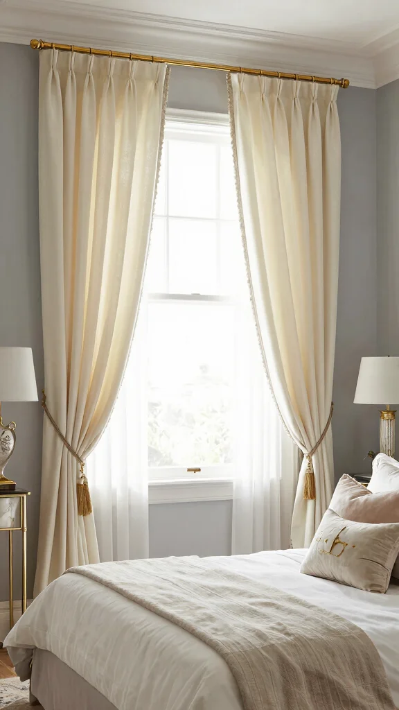 Elegant cream curtains can provide a classic contrast to your grey bedroom, adding warmth and sophistication to the design. This soft, neutral shade beautifully enhances the overall aesthetic, making it a timeless choice for decor. Cream drapes can visually soften the space, creating a cozy atmosphere that feels welcoming and stylish.