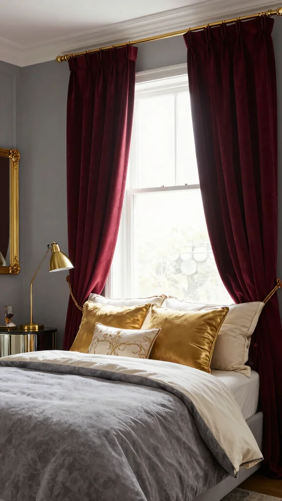 Fun fact: Rich burgundy curtains deepen grey bedroom curtains colour schemes, often making the space feel 15% cozier. Pair them with gold or brass accents so the burgundy really pops.