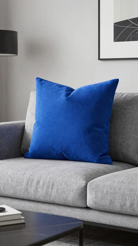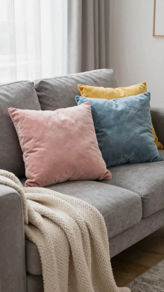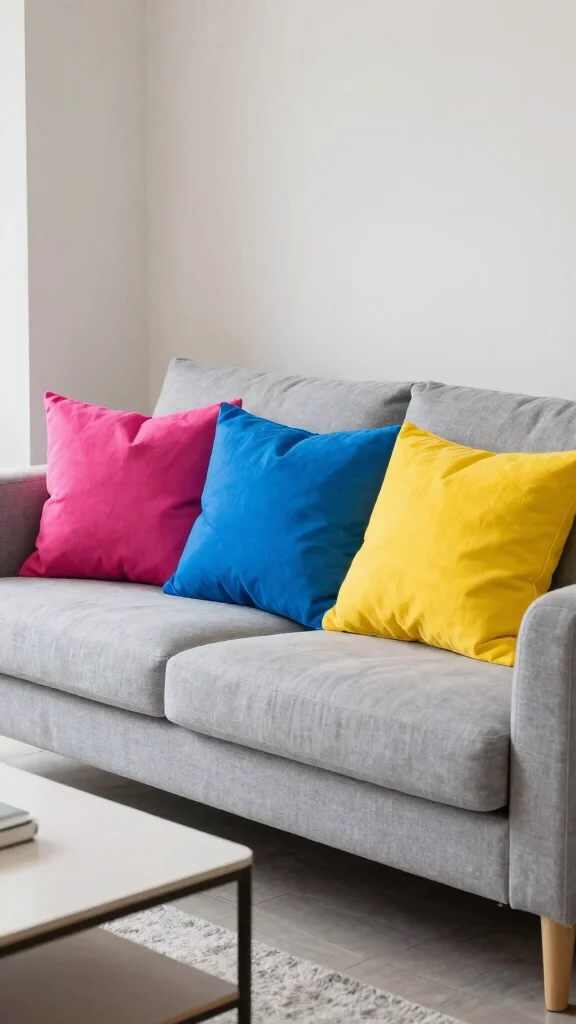 Brighten your decor with colorful throw pillows! Shades like vibrant yellows, bold blues, or rich reds can serve as striking accents against a grey couch, adding a lively touch to your space.