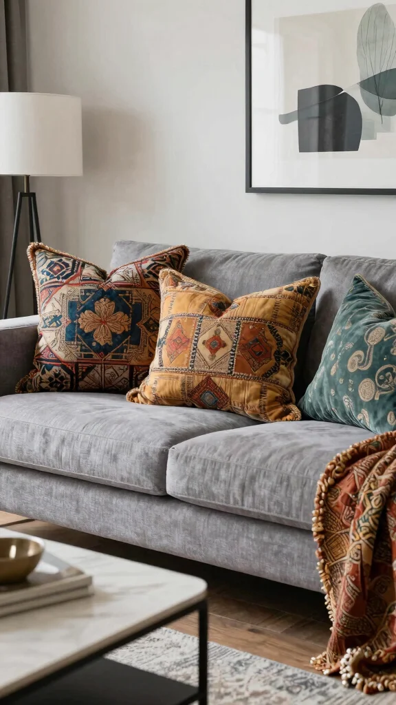 Layering vintage textiles adds a unique cultural touch to your grey couch. Seek artisanal throw pillows made from traditional fabrics or boasting intricate patterns for added depth.