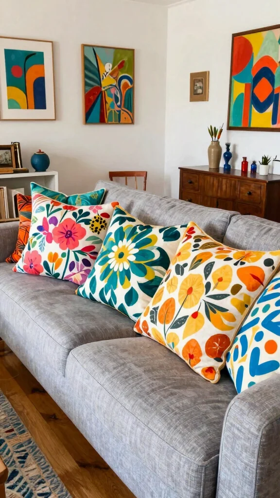This approach not only complements your grey couch but also adds a delightful personality to your home, creating a warm and inviting atmosphere.