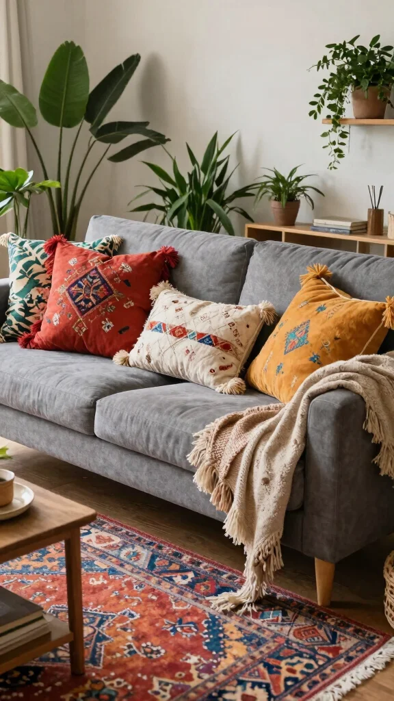 Embrace bohemian style by selecting throw pillows with eclectic patterns, textures, and colors. This approach invites warmth and creativity into your living space, making your grey couch a focal point.