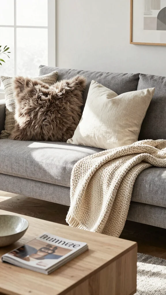 What color and texture combinations work best for a grey couch with throw pillows in a Scandinavian-inspired living room?