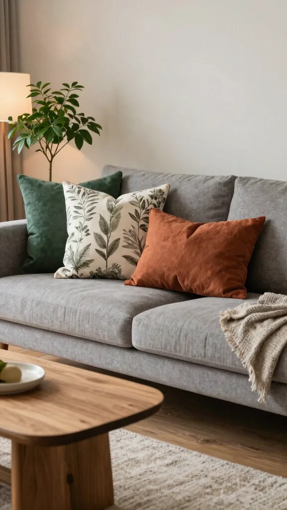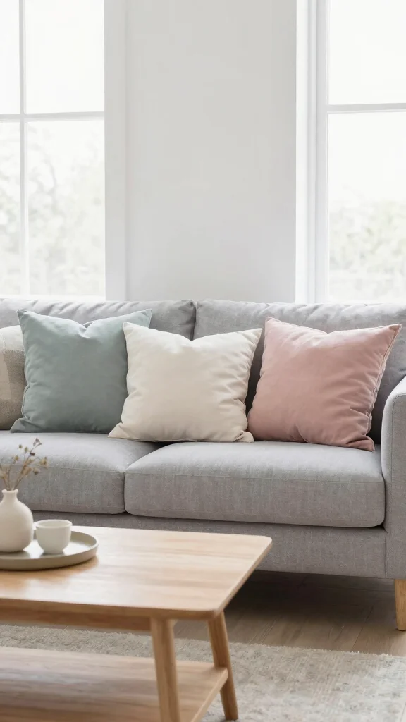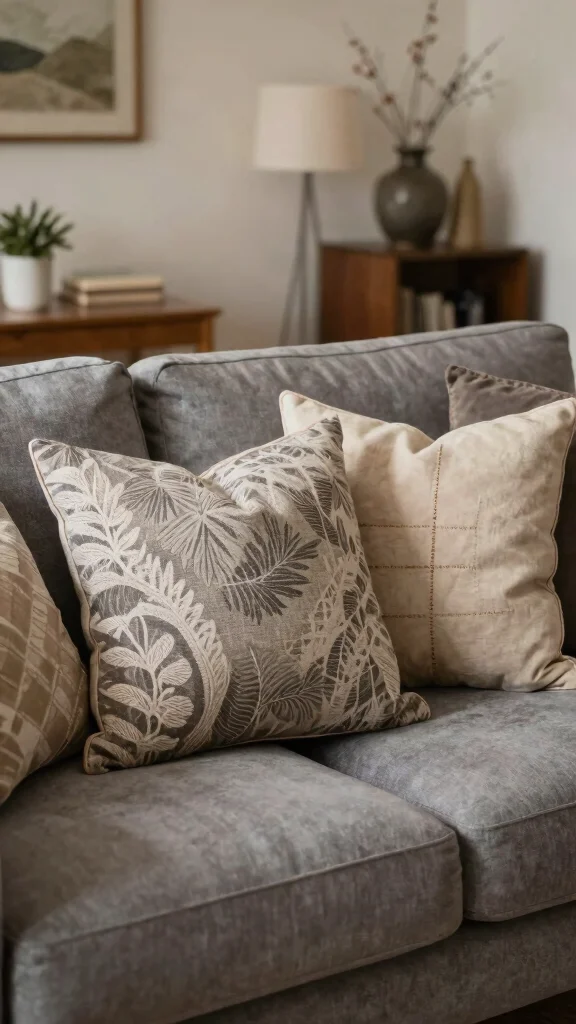 Keep colors in the same family as the grey couch (creams, taupes, soft blush, or sage) to avoid clutter.