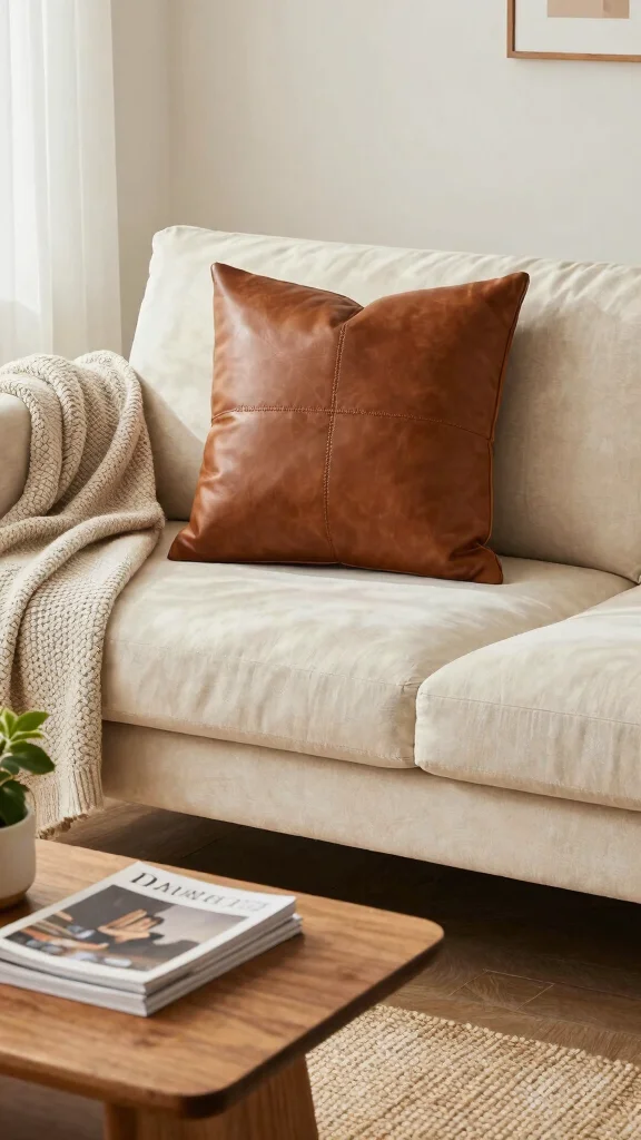 For accent pillows, try a bold color or a subtle pattern, and balance with metallic or wood-toned accents for interior design trends credibility. Don’t forget symmetry vs. asymmetry—three pillows feel balanced, while a deliberate uneven arrangement can feel chic in modern home decor. This elevates your leather couch throw pillows into a stylish focal point.