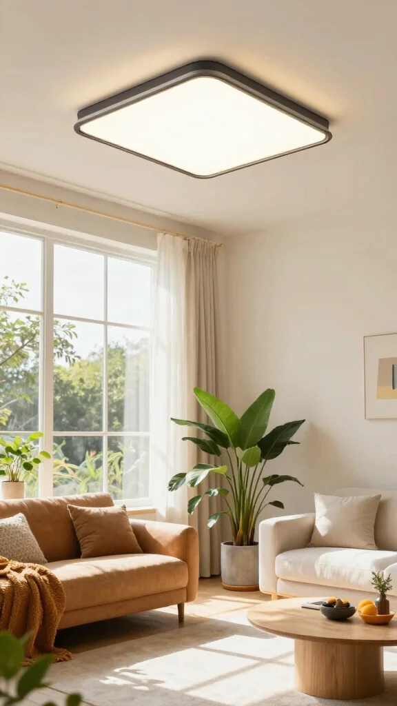 Opt for sustainable LED ceiling fixtures to reduce energy consumption and enhance your living room’s brightness.