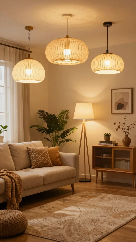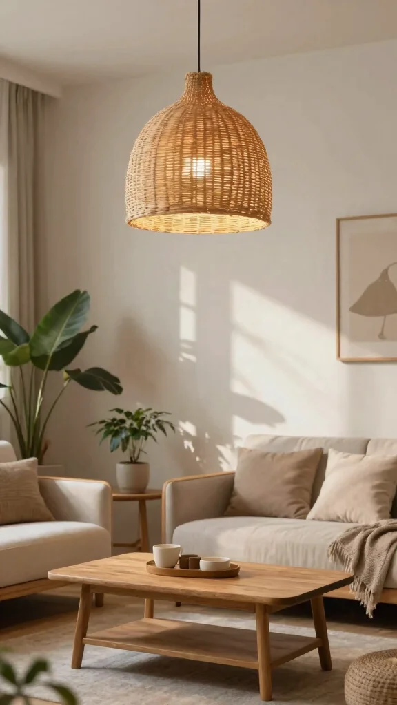 Opting for natural fiber fixtures not only enhances the visual interest of your space but also supports sustainable choices. Their soft, diffused lighting adds to the serene feel of your living room.