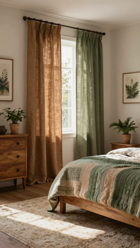 Fun fact: Linen curtains in earthy tones can instantly anchor a bedroom, reducing glare while adding texture. For a cozy bedroom escape, pair terracotta or deep green linen curtains with warm lighting and wood furniture. Tip: aim for colors 1–2 shades darker than your wall to create Rustic Earth Tones.