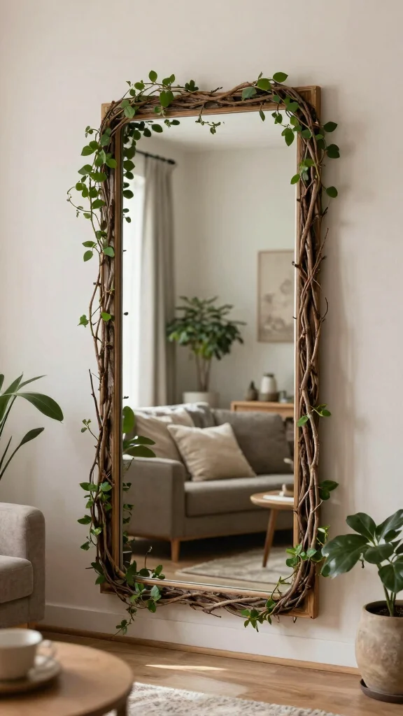 Mirrors with natural elements not only reflect light but also promote a warm, earthy ambiance in your living room.