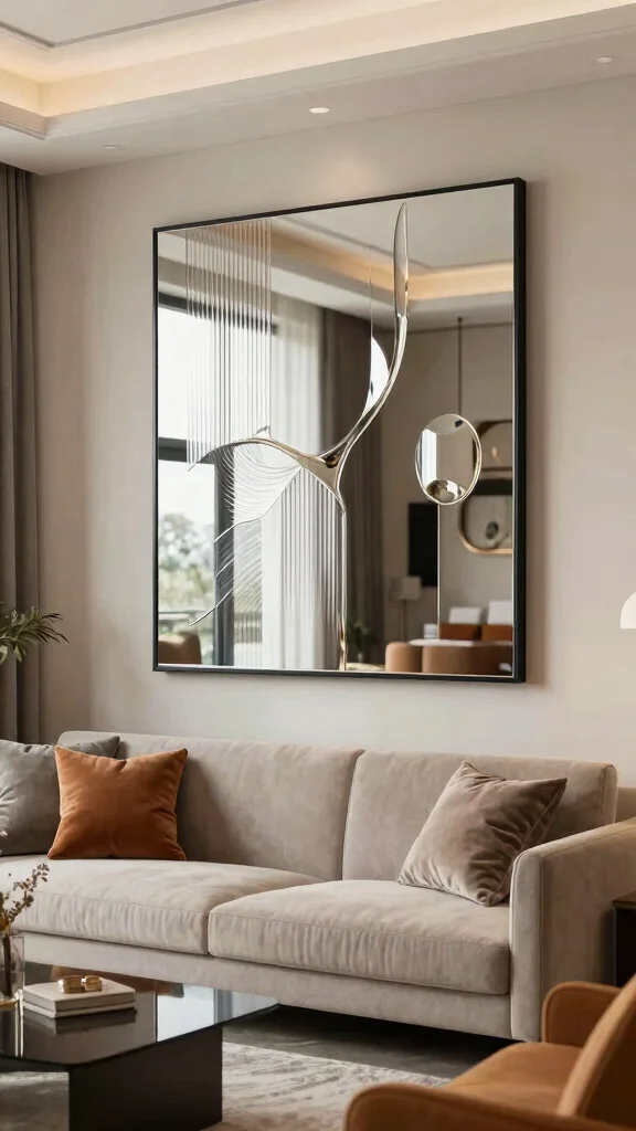 Mirrored artwork can elevate your living room’s aesthetic and create captivating reflections.