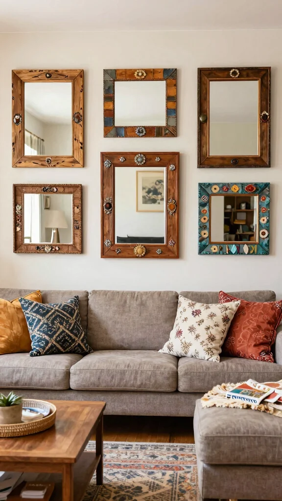 Create a stunning visual display with mirror clusters. Grouping smaller mirrors together forms an eye-catching design that adds depth and interest, reflecting light in various directions throughout your living room.