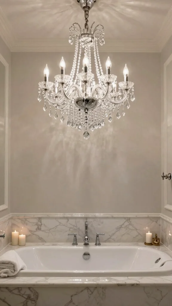 A stunning crystal chandelier can transform your master bath into a luxurious oasis. This elegant fixture not only brightens the room but also acts as a captivating focal point, drawing your attention upward with its shimmering beauty. Imagine a chandelier crafted from exquisite crystals, reflecting light in a dance of colors, making your space feel like a high-end spa retreat.