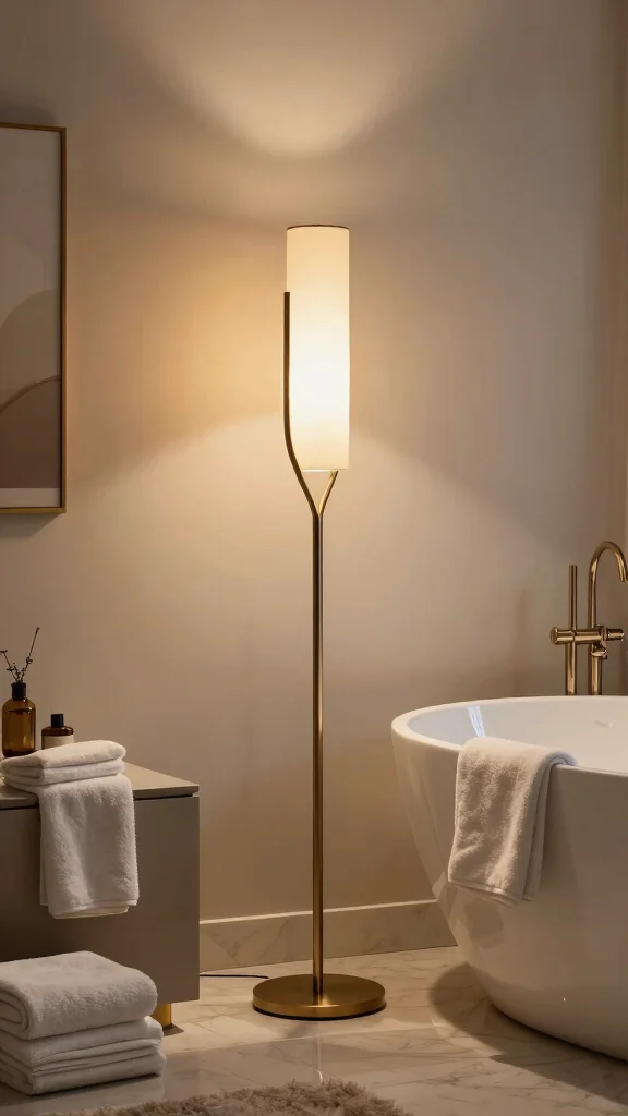 Floor lamps add height and visual interest, with versatile styles that can complement any decor theme, from bohemian to sleek modern. Placing one strategically near a seating area or beside a tub creates a cozy reading nook if space allows.