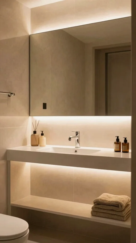 Enhancing visibility for tasks at the vanity, under-cabinet lighting creates a soft glow that can also serve as a nightlight. This lighting technique beautifully highlights decorative elements below, adding depth to your space.