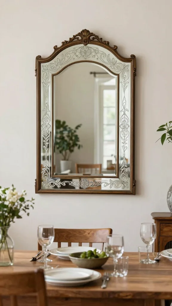 Choosing a vintage mirror with an etched design adds a delicate touch to your dining room. The intricate etchings reflect artistry and give your space a unique character.