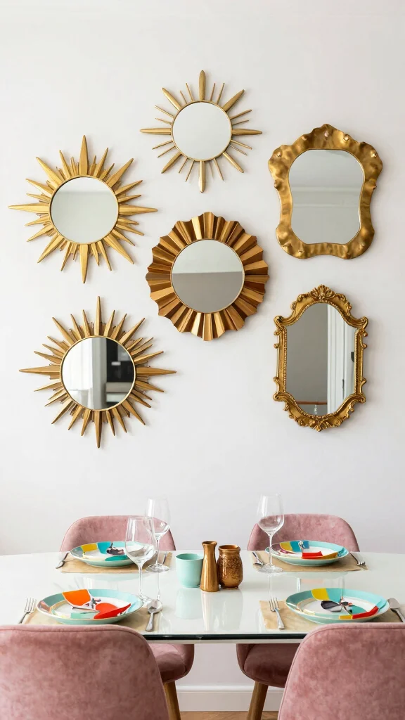 Arrange unique-shaped mirrors in a fun layout above your dining table to add character and charm. Use these mirrors to highlight particular decor elements, such as vibrant artwork or bold color schemes.