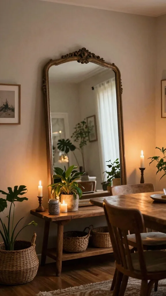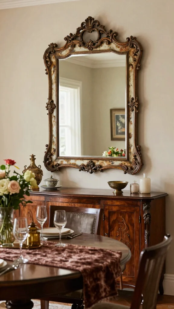A vintage mirror adorned with a decorative frame brings an artistic flair to your dining room. Look for unique frames that feature intricate carvings or charming patterns, as they add character and storytelling to your decor.