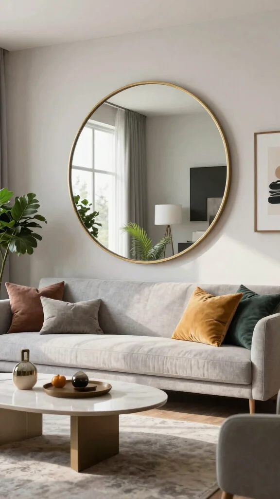 Minimalist living rooms benefit from mirrors that serve function over ornament. Opt for large rectangular mirrors to lengthen walls or tall vertical mirrors to add height. Circular mirrors add a soft focal point without bulk. Choose slim frames or frameless designs to maintain airy feel. Hang at eye level or in a tidy cluster with even spacing to reinforce order. Let the mirrors reflect daylight or warm lamp light to boost brightness—this is a staple move in wall decor ideas and home interior design.