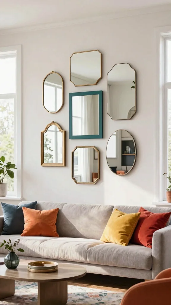 Unique mirrors can create a lively vibe in your living room, maintaining a sense of openness while reflecting your personal style.