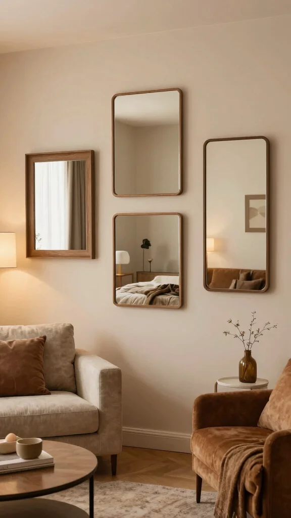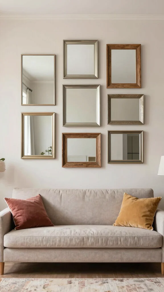 Decorative mirror clusters can refresh your living room decor while enhancing overall spaciousness and light.