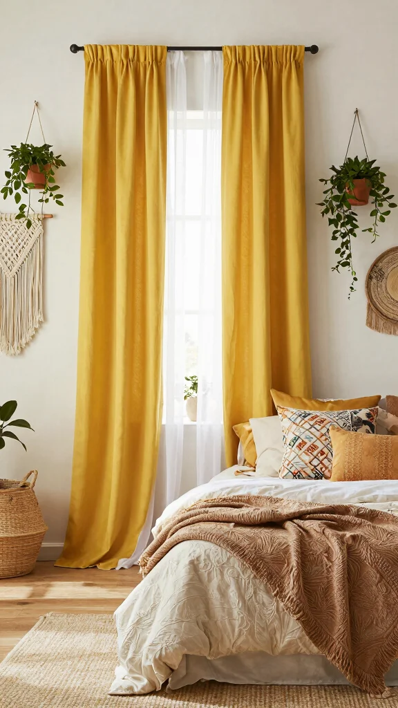 Immerse yourself in the free-spirited essence of bohemian decor with vibrant mustard yellow curtains that harmonize beautifully with diverse textures.