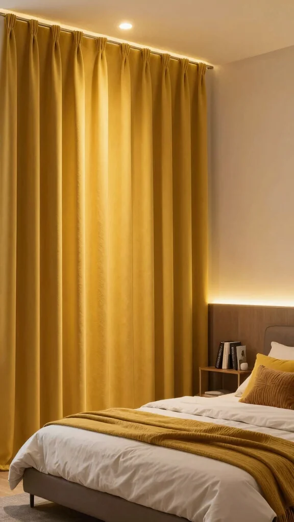 Combine mustard yellow curtains with smart lighting to elevate the mood of your bedroom effortlessly.