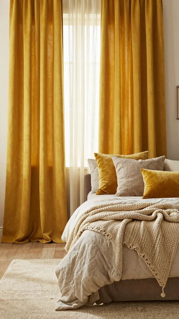 Layering textures is essential for creating a visually rich look in your bedroom with mustard yellow curtains.