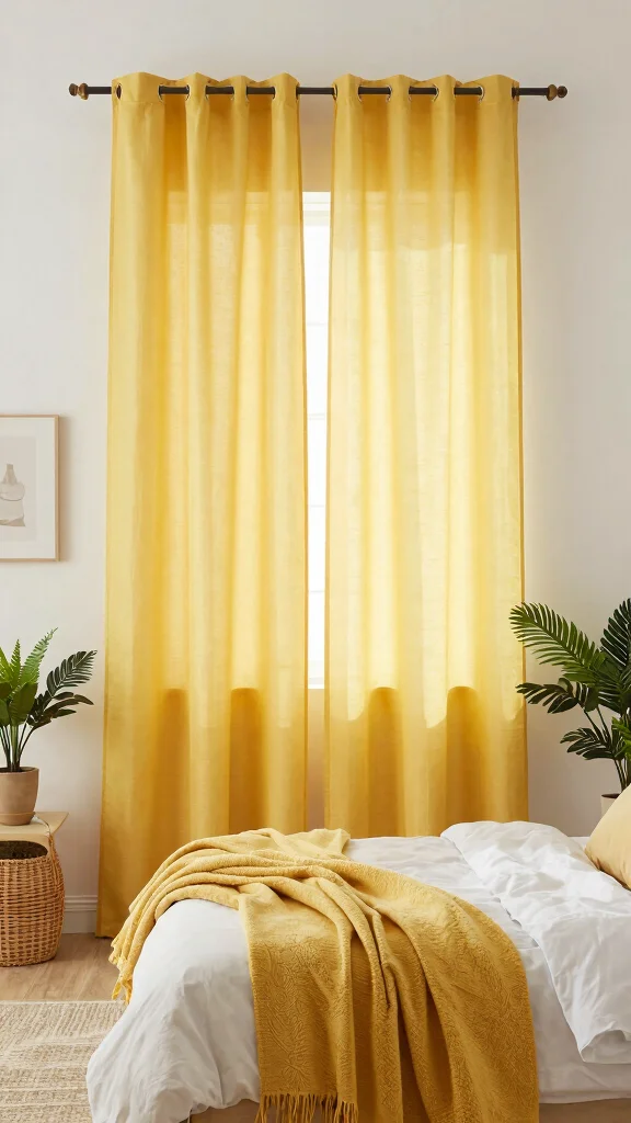 Finish with accent colors drawn from the curtains (terra cotta, sage, navy) to keep your yellow curtain styles harmonious within your home decor tips and bedroom color schemes.