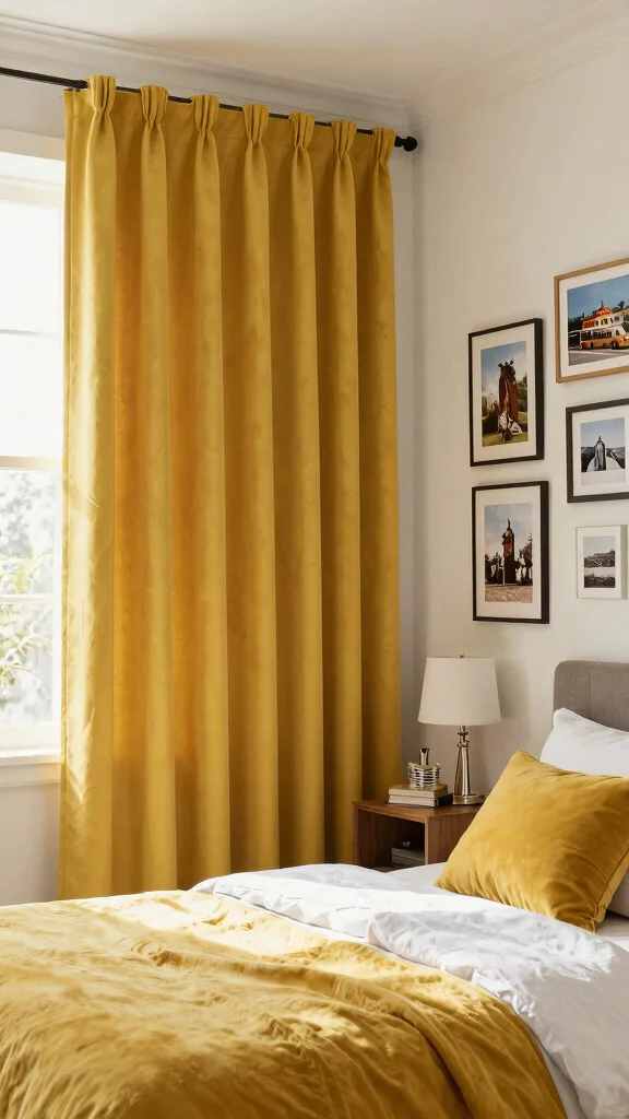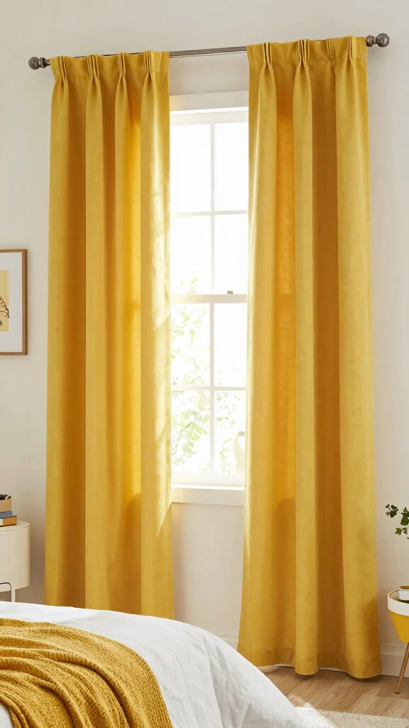Consider how mustard yellow curtains can create a warm welcome from the moment you step into your room.
