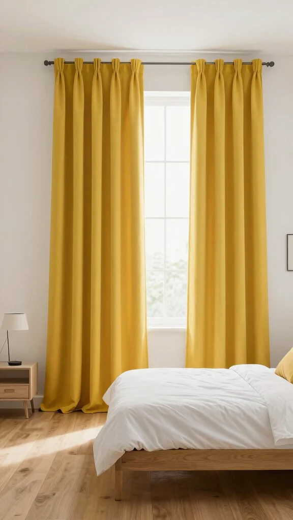 Fun fact: In a modern minimalist bedroom, mustard yellow curtains can lift mood by up to 20% when paired with neutral walls. Keeping accessories minimal lets the bold hue do the talking and makes the space feel larger and brighter.