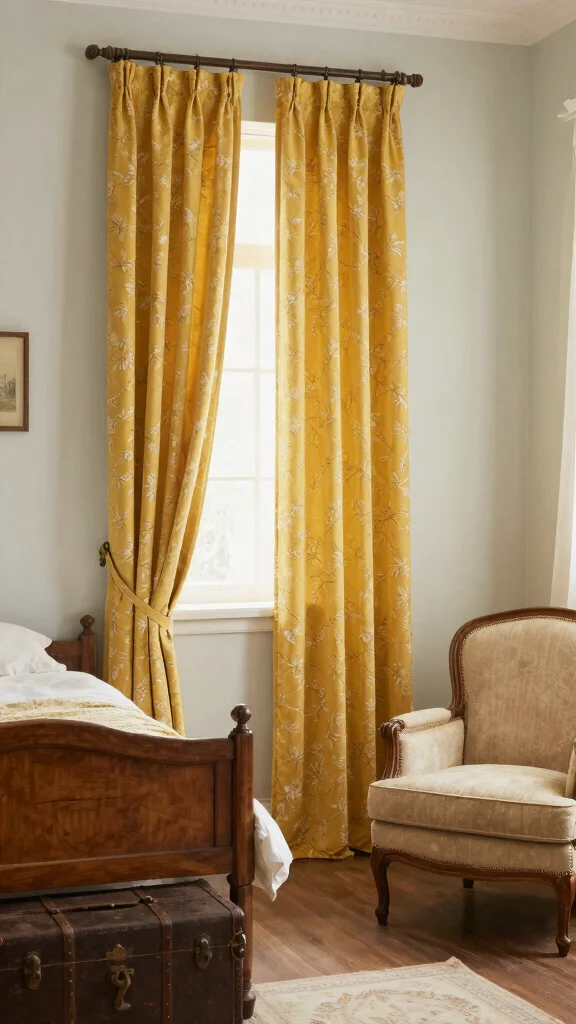 Infuse your bedroom with a cozy vintage charm by adorning the windows with mustard yellow curtains alongside antique furnishings.